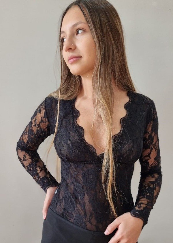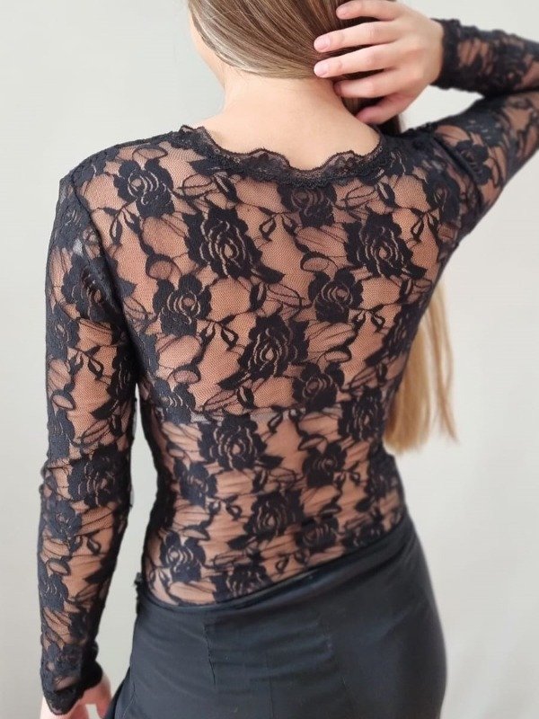BODY DE ENCAJE CON DETALLES DE PUNTILLA, MANGAS LARGAS. DELANTERO FORRADO CON TUL PIEL. ESTILO COLALESS, CON BROCHE EN ENTREPIERNA DESMONTABLE.