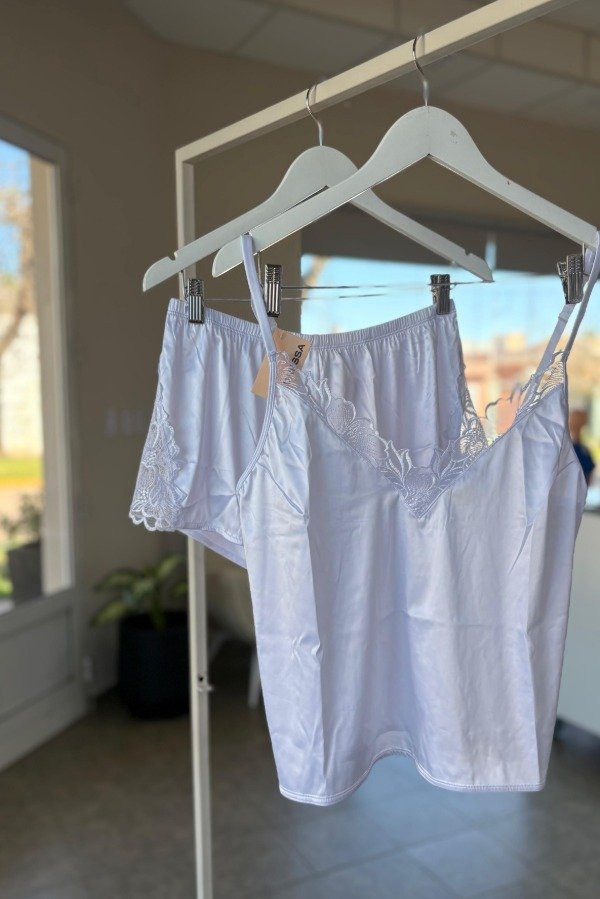 PIJAMA DE BRETELERA CON SHORT DE RASO Y TUL BORDADO.